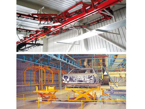 汽车涂装线的前处理、电泳生产线,一般采用积放链、普通悬链、自行小车等;中涂、面漆采用滑撬式地面输送链或其它形式的地面输送设备。对于摩托车、家电或其它工件,可采用普通和轻型悬挂输送链或普通和轻型积放悬挂输送链。对悬挂输送链,为防止链条油污等污染工件,通常采用集油盘和“C”形吊具。